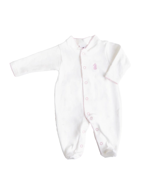 Enterito con pie color crema de 100% Algodón Peruano (PIMA) con picot y bordado gris.